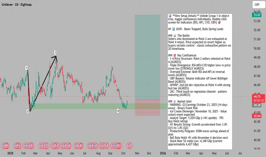 On the 2-day timeframe, Unilever has established a classic bear trap formation. After Point 3 closed above Point 1, it confirmed Point 2 as a proven set of sellers who successfully pushed price lower. Now at Point 4, price has returned to test these sellers once again - but this time, the bears are showing exhaustion. Multiple technical indicators reveal weakening selling pressure through bullish divergences, oversold conditions, and support confluence at critical levels. The thesis: institutional sellers who dominated at Point 2 have depleted their ammunition, and price should now revert upward as buyers reclaim control, potentially targeting the Point 3 highs or beyond. This is a participant exhaustion setup where the losing side (bears) gets punished with a reversal move.
