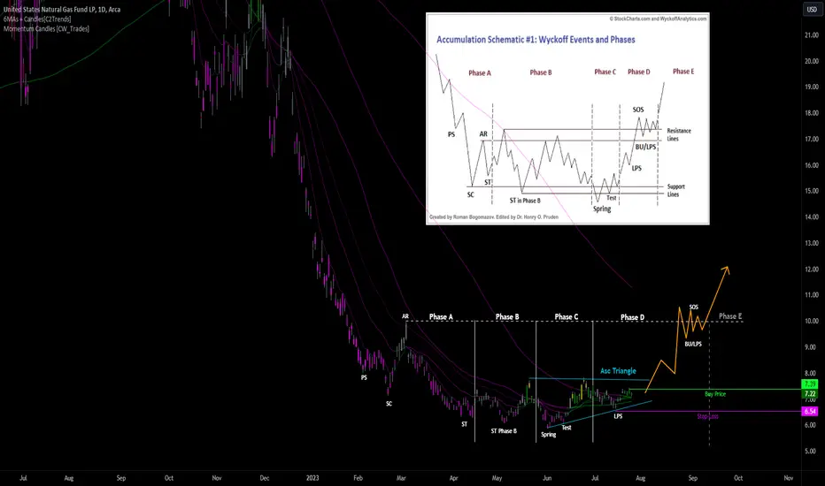United States Natural Gas Fund appears to be in the process of heading into the Back Up(BU) phase of a Wyckoff Accumulation pattern after levelling off in the $7 area after seeing a ~75% decline from the August '22 high near $35. There is also an ascending triangle pattern forming in phases C and D which tend to result in higher prices as UNG puts in a series of higher lows. What we want to see as a sign of strength going forward is for price to move above the upper blue line of the triangle pattern and follow the trajectory of the orange arrow which represents the anticipated path for price.