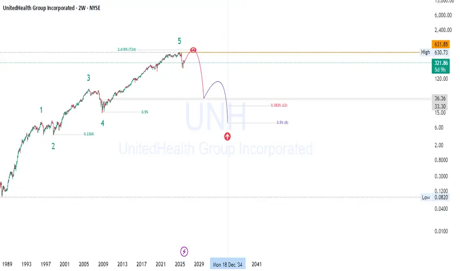 This setup suggests UNH may be entering a multi-year corrective phase, fully consistent with long-term market cycles and technical exhaustion.