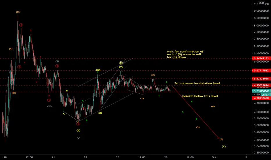 UNIUSD - It is in ABC correction from major top, where A and B wave seems completed. and it is in C wave down where 3rd of 3rd down is in progress, so sell it in smaller bounce upto 4.78-4.86 with stops above 4.96 for target below 3.60 or even lower. It is possible that it can go higher to extend 2nd subwave correction. but stay as per plan for sell trade set up.