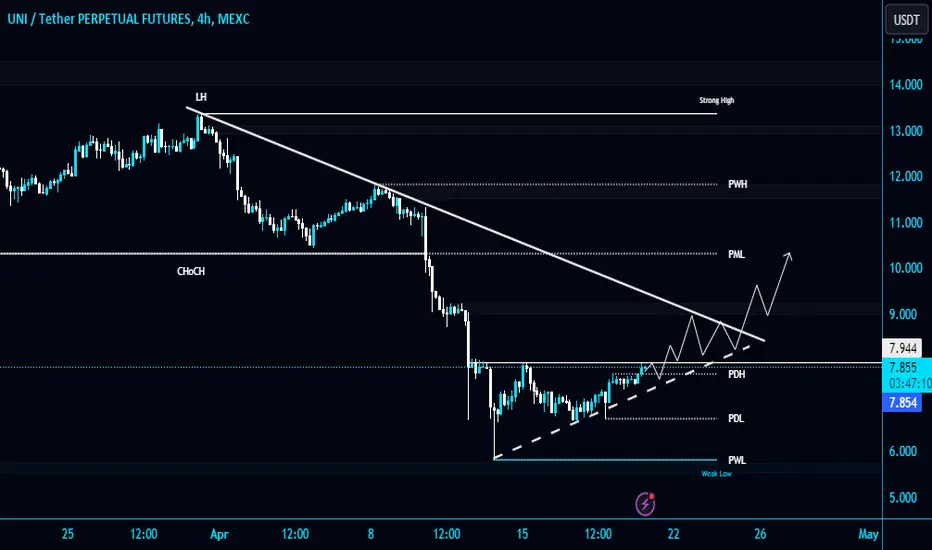 UNI needs to clear the Triangle resistance line to gain the bullish momentum. The next local resistance level is PML $10.31. The strong support level is PWL $5.85.