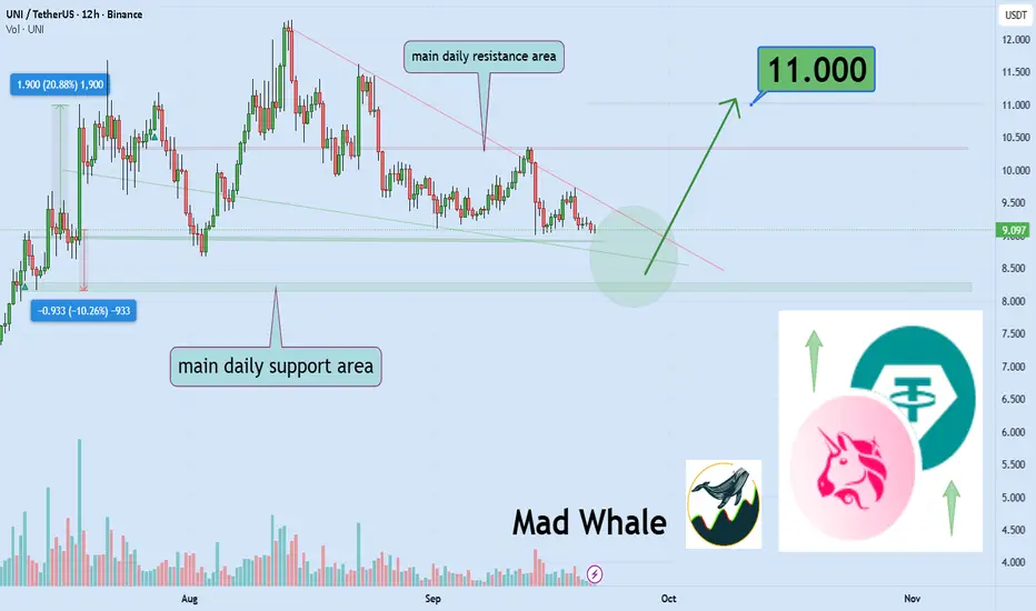 UNIUSDT is approaching two key support zones while testing the psychological resistance at 10. A clear breakout above this level could signal a continuation move of around 20%, with price targeting the 11 area. 📊🚀