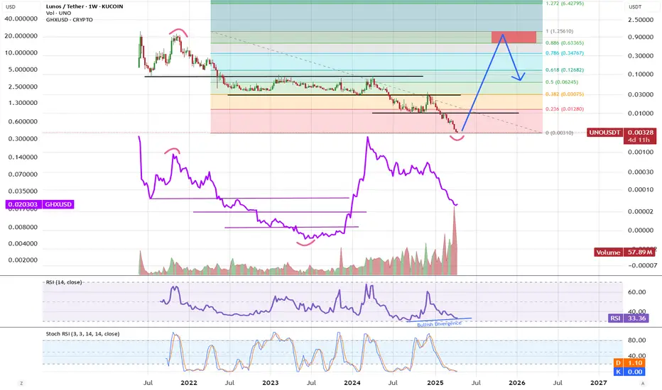 UNO had a deep correction. Price is in oversold range with bullish divergence. Looking at pattern we see similar pattern to GHX before it blasted up to test Oct/Nov 2021 pivot.