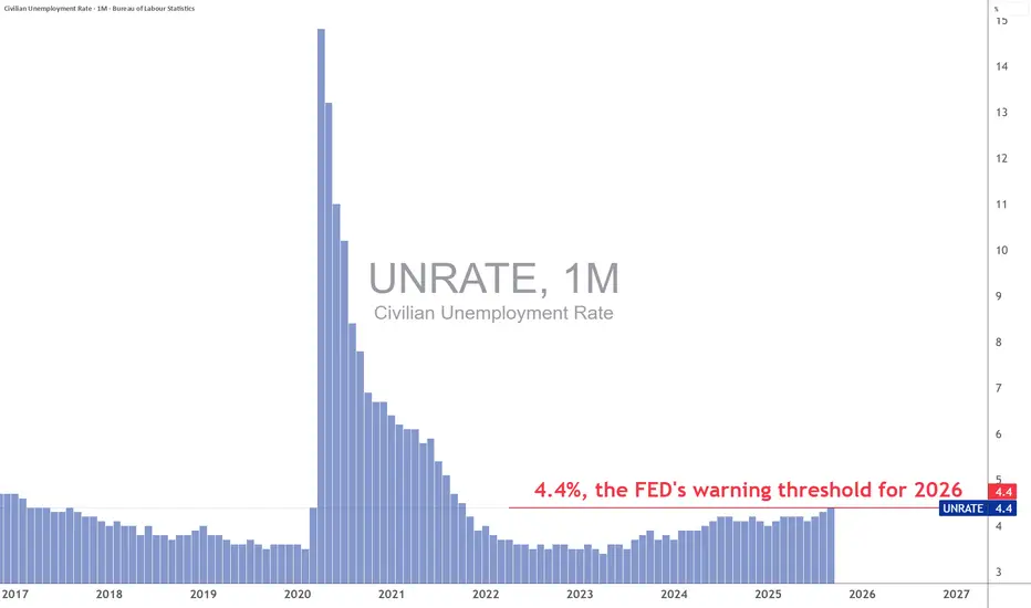 These figures attract heightened attention because the U.S. unemployment rate is already at 4.4%, a level with heavy implications. This threshold is far from trivial: it corresponds exactly to the alert level the Fed included in its own median scenario for 2026, as shown in the official projections released at the last FOMC. In other words, the U.S. economy has reached today the unemployment rate the Fed expected to be acceptable… one year from now. This quicker-than-anticipated deterioration now makes employment the key factor of the coming months.