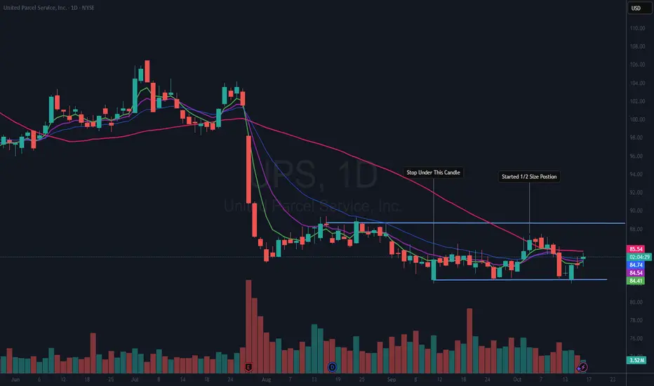 The plan is to hold the position until either a breakout above the blue resistance area occurs—at which point the position would be increased in anticipation of a stage 2 breakout—or until the price falls below $82.00, activating the stop-loss. If not currently in this trade, the preferred approach would be to wait for the stock to close above the 50 DMA again or for a breakout above the upper horizontal resistance area before entering.
