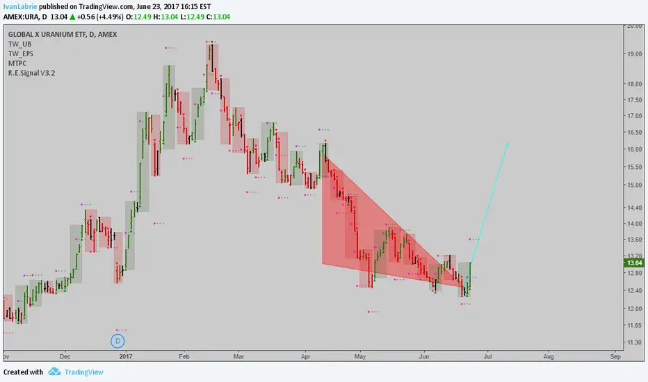 URA has bottomed here. If this is the case, we can expect a rapid rally as depicted on chart. Odds are low, but risk/reward is significant if this trade works well. You can enter with a tight stop under the lows, or risk 3x the ATR value down from entry.
