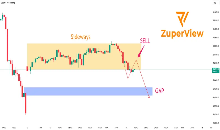 US100 is in a short-term correction phase. If price continues to reject the 24,700 resistance area, the downside scenario toward the 24,250–24,350 GAP support zone remains valid.