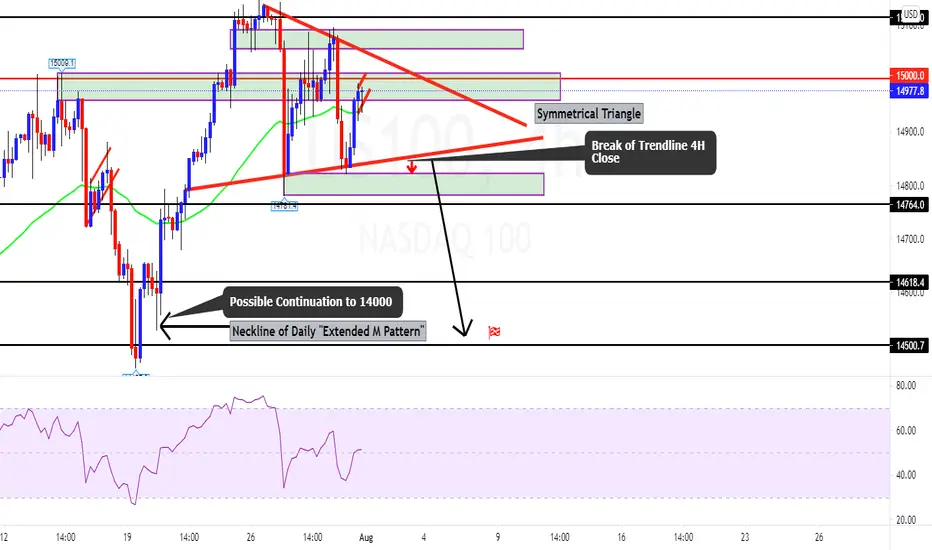 Daily bearish divergence. 4H symmetrical triangle. Currently rising flag pattern on 15 min inside the 4H zone indicating possible sell from zone. Once 4H closes below outside of triangle expecting price to go to 14500. That is neckline of the "Extended M Pattern". Since there is Daily bearish divergence it's possible for continuation from Daily "Extended M Pattern" neckline 14500 to 14000.