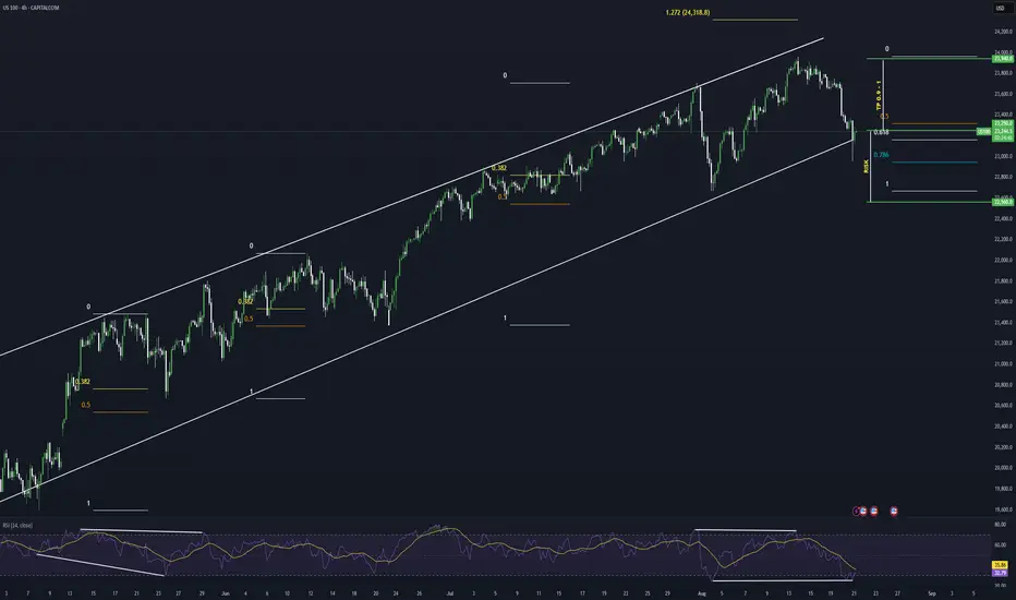 NASDAQ price action seems to exhibit signs of potential Bullish momentum as the price action may form a credible Higher Low with multiple confluences through key Fibonacci and Support levels which presents us with a potential long opportunity.
