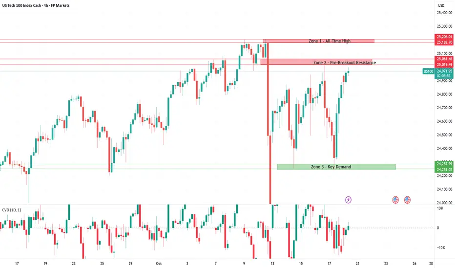 After a volatile end to last week, US100 is starting the new week with a tone of cautious optimism. On Friday, renewed tension between the US and China rattled markets, as Washington floated new tariffs and export restrictions while Beijing hinted at countermeasures. However, over the weekend the tone softened, US officials signaled that they did not intend to escalate the trade conflict further, which helped calm investor nerves and lifted sentiment in global markets, particularly in Asia.