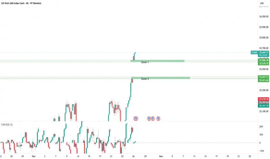 This zone represents last week’s all-time high, now turned into support after the breakout. The strong impulse above this level indicates that what was once a major resistance has now flipped into a structural base for the new leg higher. If the market revisits Zone 2, it will serve as a key test of buyer strength and validation of the breakout’s sustainability. Holding this zone will reinforce bullish market structure, while a clean break below could expose the unfilled gap beneath.