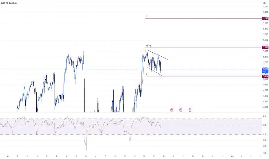 The NASDAQ is currently forming a bullish flag pattern. If the price breaks above the flag structure, a Buy Stop order will be placed.
