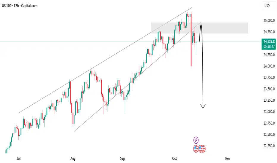 The US100 is showing signs of bearish pressure as price action has tightened near the top resistance zone. Buyers appear to be losing momentum, and the recent structure suggests a potential rejection from the upper boundary.