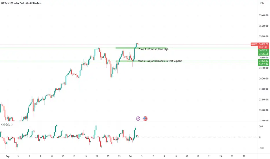 US100 is now trading around prior all-time highs, which makes the market particularly sensitive. While the broader trend remains bullish, traders should exercise caution: at uncharted levels, price can become highly volatile, and fake breakouts are common. Careful risk management is advised when operating near these extremes.