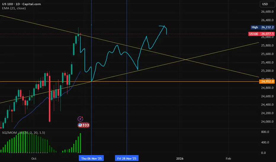 Due since april we have monthly 7 green candles, we need a reversal and red candle in November to continue then the movement to 27,000. But first a back movement to 25,000 and triangle pattern could be the movement for november.
