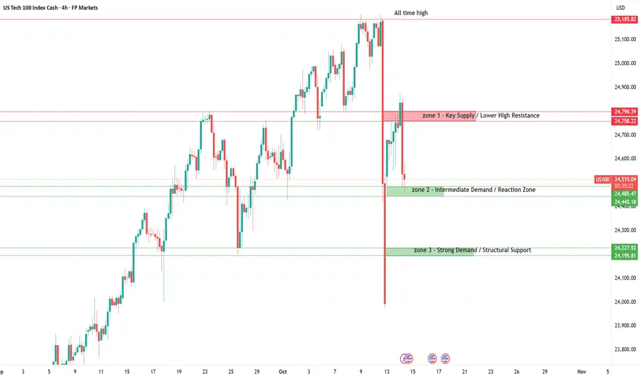 This zone has shown reactive buying interest and currently acts as short-term support. It’s where price paused after the last major drop, showing the presence of responsive buyers. Holding above this zone keeps the intraday bias neutral-to-bullish, but a decisive break below would expose the next, stronger demand layer.