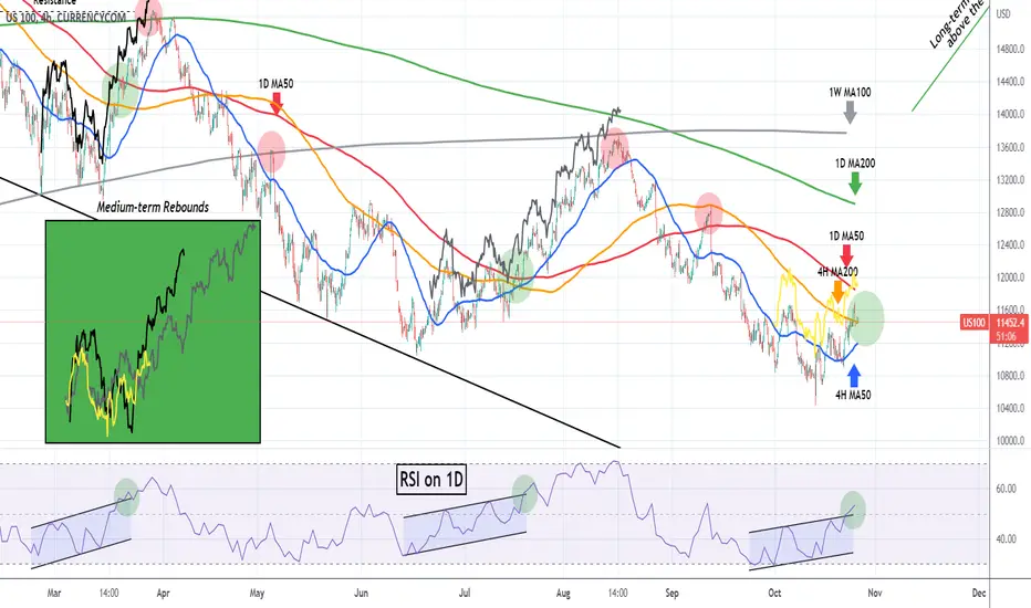 Just a few days following our last analysis, the Nasdaq Index (NDX) broke above its 4H MA200 (orange trend-line) for the first time since August 26: