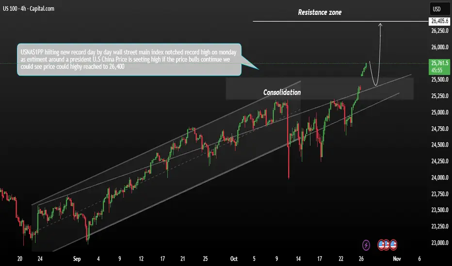 The USNAS100 hit a new record high on Monday, driven by growing expectations of U.S. Federal Reserve interest rate cuts that continue to boost risk appetite. Optimism surrounding a potential U.S.–China trade agreement also supported sentiment at the start of a week dominated by major tech earnings.