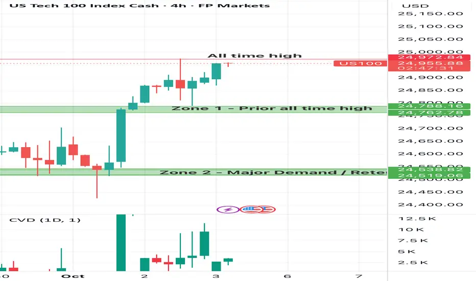 The Nas100 is trading in uncharted territory after breaking to fresh all-time highs. Sentiment remains bullish, supported by falling bond yields and growing expectations of Fed rate cuts, which make growth and tech stocks more attractive. The rally is also fueled by strong momentum in AI and technology names, with FOMO adding to buying pressure.