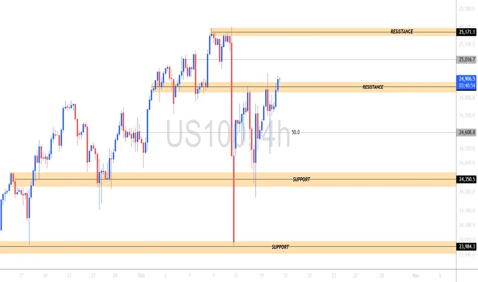 Price is currently trading around the 24,907 🔼 resistance zone after bouncing from the 24,350 🔽 support area. Bulls have regained some momentum, but the index still faces a strong barrier at 24,907. A breakout above this level could open the way toward 25,171 🔼, while rejection could drag price back to mid-range levels.