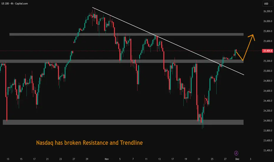 Nasdaq has broken Resistance and Trendline. US economy is doing well. Uptrend may continue.