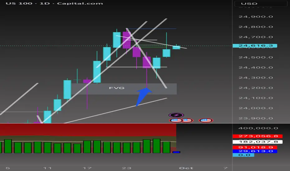 ⚡️Volatility note: Daily volatility is starting to compress (blue print on my model), meaning the next breakout move could expand strongly. If price breaks above the trendline with momentum, buyers may look beyond 24,650 toward 24,720–24,800 before reevaluating. If rejection holds, compressed volatility could fuel an accelerated drop into the 24,520 → 24,440 FVG zone, and possibly 24,300.