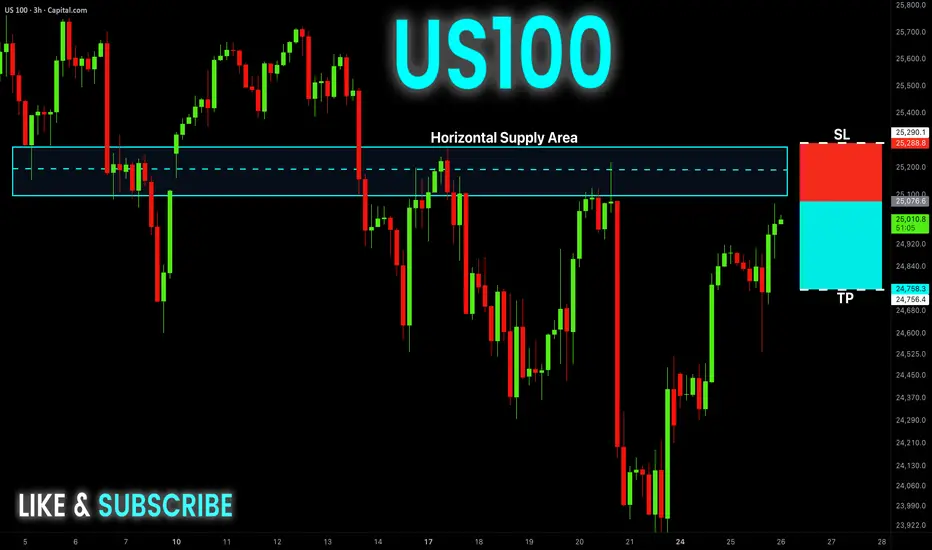 US100 has swept internal liquidity and is now approaching the horizontal supply but hasn’t retested it yet. If the retest confirms distribution, SMC flow favors a drop toward the next sell-side liquidity zone.