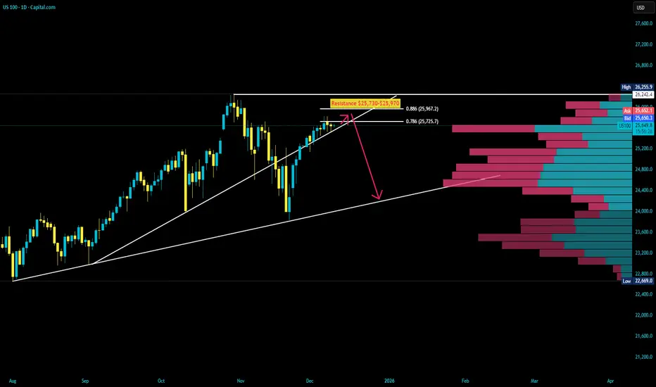 US100: Tough resistance zone at 25,730–25,970. If price fails to hold above 25,730 after today’s FOMC decision, a sharp sell-off toward 24,200 becomes highly probable.