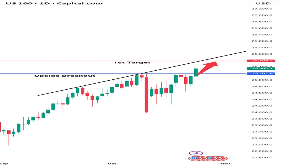 US 100 has broken above key resistance at 25,074, confirming a bullish breakout. Price is now at 25,508, supported by VWAP and 5 EMA. Momentum favors buyers, with the 1st target near 27,000, expected to be reached in the upcoming week if trend strength continues. Ideal entry on pullbacks or bullish continuation candles. Place stop-loss below breakout zone at 24,800 to manage risk. Watch for volume confirmation and sustained price action. This setup offers a short-term opportunity for swing traders aiming to ride the breakout wave.