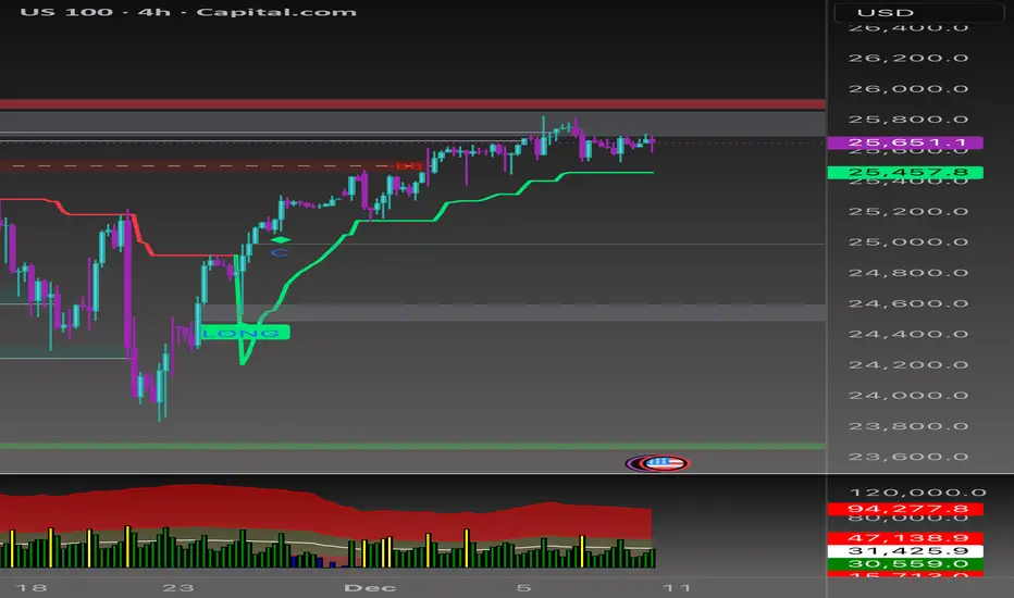 • TrendMaster (4H) held as dynamic support on every dip, but it’s starting to flatten, showing we’re consolidating at the top.