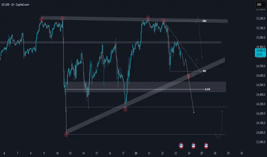 On the 4H timeframe, the index is approaching the trendline support around 24,600, which marks the third touch of this level. If this zone fails to hold, we could see an extended move toward the 24,000 area.