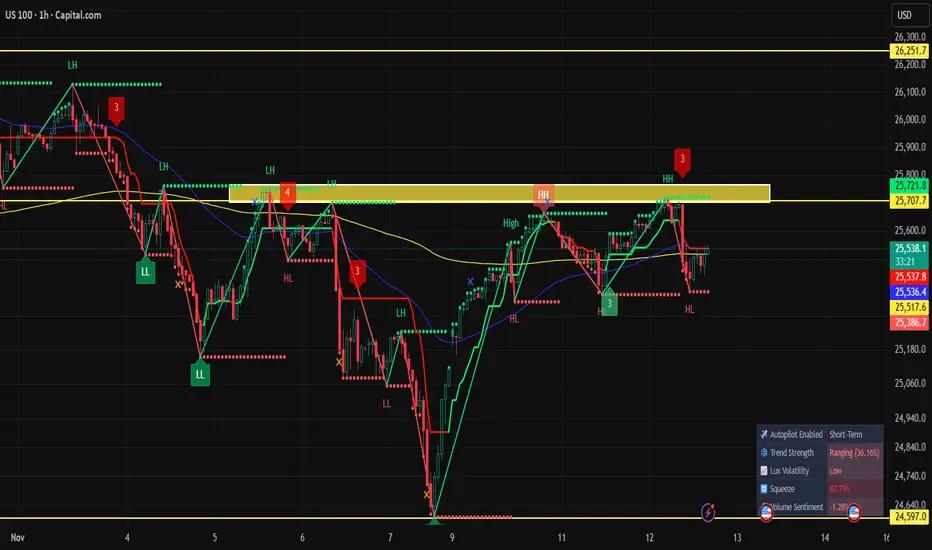 US100 has reversed the entire dump and is now coiling directly under a major supply band. Every pullback since the V-shaped bottom has formed a higher low and none of them have broken structure. Sellers keep defending the same yellow zone around 25700–25780 but each rejection has lost impact. That’s absorption.