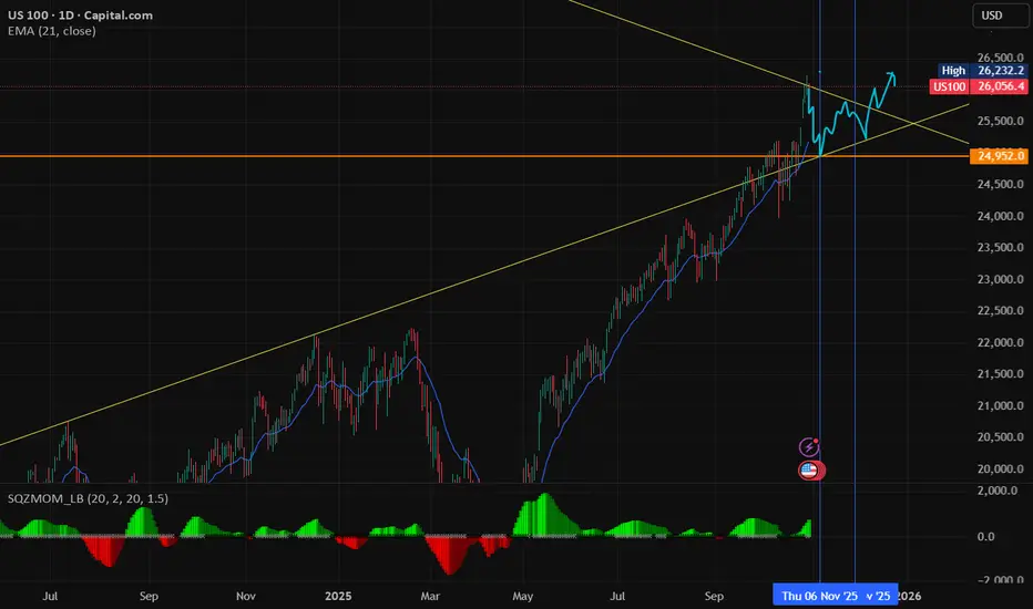 Due since april we have monthly 7 green candles, we need a reversal and red candle in November to continue then the movement to 27,000. But first a back movement to 25,000 and triangle pattern could be the movement for november.