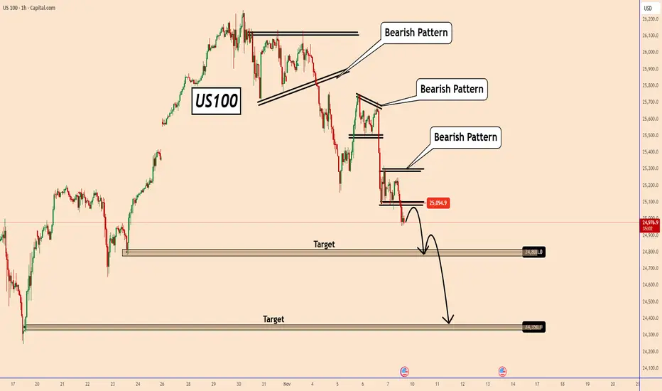 If the price respects this new bearish structure, we could see US100 falling to 24800 and 24350 first.