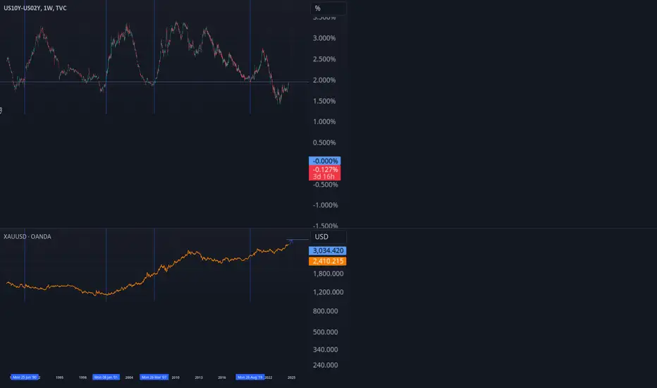 As the yield curve re-inverts, it presents an opportunity for safe haven assets like gold to outperform. The only outlier was 1980 and 1982 when gold had already increased 800% in the few years prior due to Fed Volcker's era of runaway inflation.