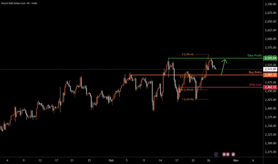 Buy entry is at 2,497.81, which is an overlap support that aligns with he 50% Fibonacci retracement.