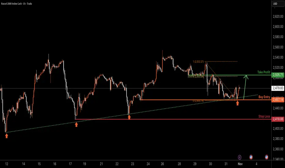 Take profit is at 2,505.71, whic is an overlap resistance that aligns with the 61.8% Fibonacci retracement.