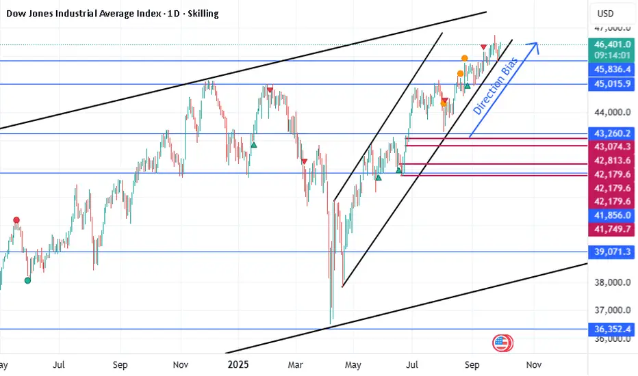 The US30 remains in a clear uptrend, supported by both fundamentals and technicals, so the preferred strategy is to buy dips rather than chase price at current highs. Fundamentally, the backdrop favors equities as the Fed has already started easing with rate cuts, GDP growth remains firm at 3.8%, and inflation is sticky but not spiraling, which keeps the door open for further monetary support. From a price action and SMC perspective, the index is trading near the top of its ascending channel, so the best opportunity is to wait for corrective pullbacks into demand zones where institutional buying is likely to step back in. The primary buy zone is between 45,860 and 45,670, which aligns with recent order blocks and imbalances, and a secondary deeper zone lies near 45,015 if volatility increases. The trade plan is to enter longs around these levels with stops placed below 45,500 to protect against a deeper sweep, while targeting a return to recent highs at 46,400 and an eventual extension toward 47,000–47,500. If instead price breaks cleanly above 46,500 with strong momentum, a breakout-and-retest setup provides another long entry on a pullback to 46,300–46,400, with stops below 46,000 and targets around 47,200–47,800. Overall, the bias is firmly bullish, and the strategy is to position for continuation higher by buying dips into demand or confirmed breakouts, always managing risk with partial profits and trailing stops as price advances.