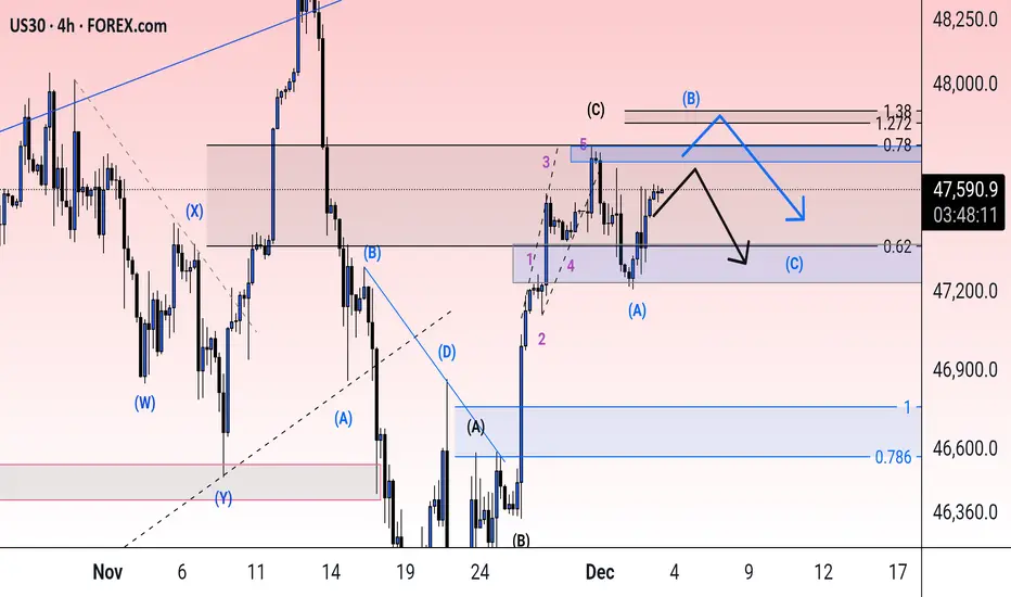 Given the completion of the recent bullish wave, the current corrective trend is expected to continue along the indicated paths. If the index breaks through the resistance area, the blue path will be the alternative scenario.