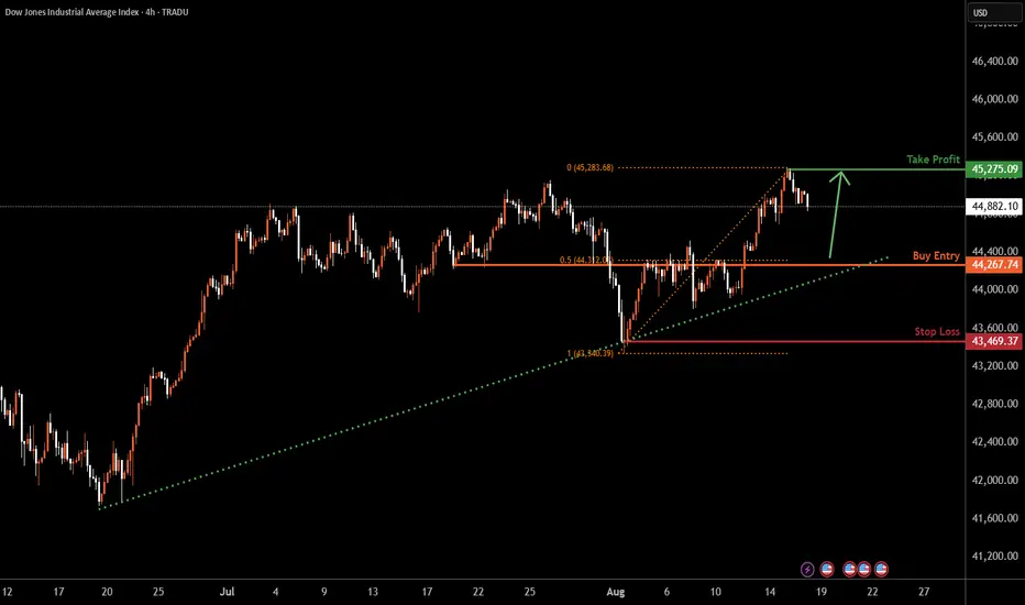 Dow Jones (US30) is falling towards the buy entry, which is an overlap support that lines up with the 50% Fibonacci retracement and could bounce from this level to the swing high.