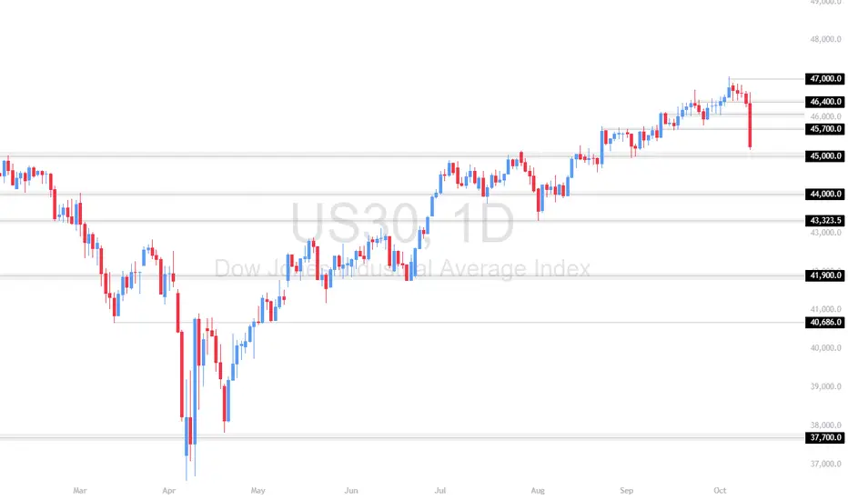 After the sharp selloff that followed the tariff announcement shock, US30 broke below 46,400.00 and 45,700.00, plunging toward the key 45,000.00 psychological zone.
