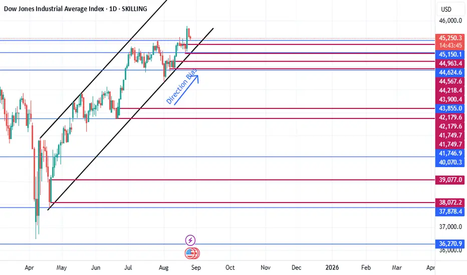 The US30 (Dow Jones) remains within a well-defined bullish channel, with recent price action rejecting the upper boundary around 45,350–45,261. This rejection looks like a liquidity grab above prior highs, a common SMC move before a deeper retracement. The nearest demand zone lies between 44,624 – 44,218, which coincides with an order block and previous consolidation. As long as price holds this zone, the market structure remains bullish, and longs targeting 45,261 and eventually 46,000 are favorable. A break below 43,855, however, would signal a market structure shift to bearish, opening downside targets at 42,179 – 41,746.