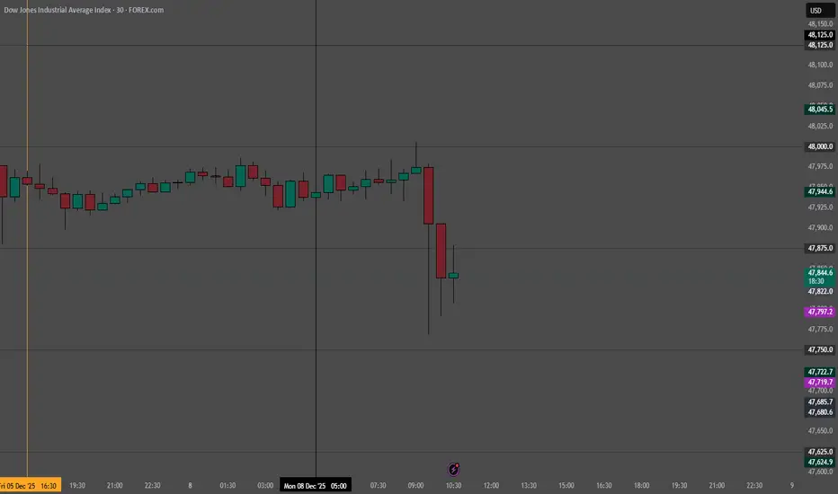First post! I wanted to try something different and new by posting my understandings of US30. US30 tends to fake out before the real move. In my chart I like to label what I would consider whole number quarter levels. I like to wait to see some sort of opposite candle of the overall potential continuation. My Take profits are usually from 600-1250 of a continuance of the move for the day. https://www.tradingview.com/x/rPjZH5eA/
