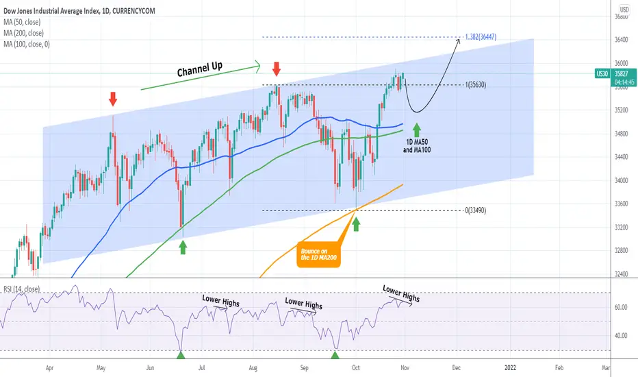 As you see, the bounce on the 1D MA200 gave a perfect bottom buy signal and the 35900 target has been achieved. Even though the long-term target is the 1.382 Fibonacci extension (36,450), the price is trading very close to the Channel Up with the 1D RSI on Lower Highs. This RSI formation has been recently seen on tops with the price correcting afterwards to the 1D MA50 (blue trend-line) and the 1D MA100 (green trend-line). On this index, it is best to wait for such contact before targeting the eventual 1.382 Fib extension.