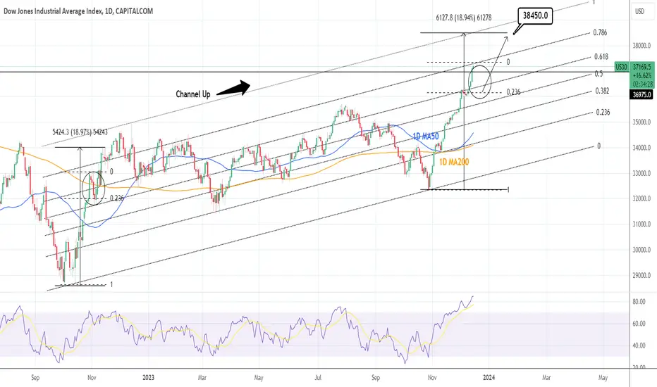 Dow Jones made new All Time High yesterday and today reached the 0.786 Fibonacci Channel level of the 14 month Channel Up pattern. Needless to say it is massively overbought on the 1D timeframe (RSI = 79.702, MACD = 696.100, ADX = 90.584). The sheer strenght of this rise since the October 27th bottom can only be compared to the first rise of the Channel in October-November 2022.