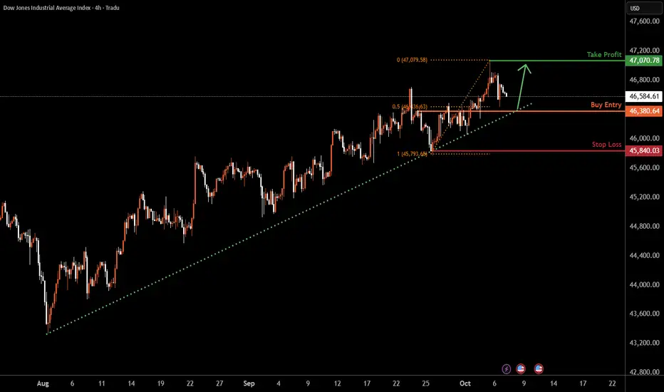 Based on the H4 chart analysis, we could see the price fall to the buy entry at 46,380.64, whichis a pullback support that aligns with the 50% Fibonacci retracement and could bounce from this level to the upside.