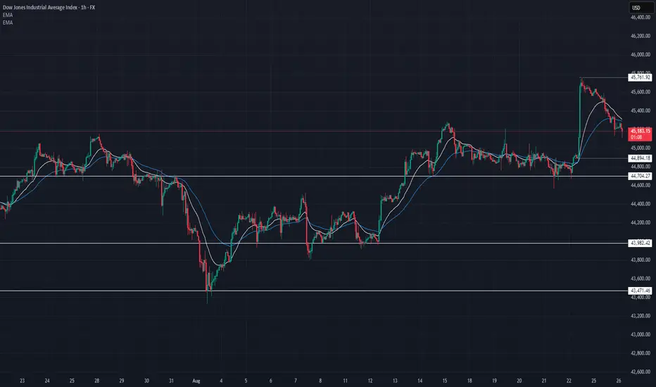 US30 ripped into 45,761 last week but failed to sustain momentum, rejecting hard and pulling back. Now trading around 45,170, price is consolidating just under the EMA cluster and recent highs.