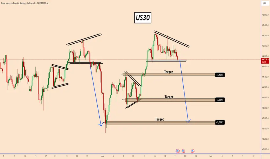 On the left side of the chart, we can see that after breaking below the second pattern, US30 experienced a sharp bearish move.