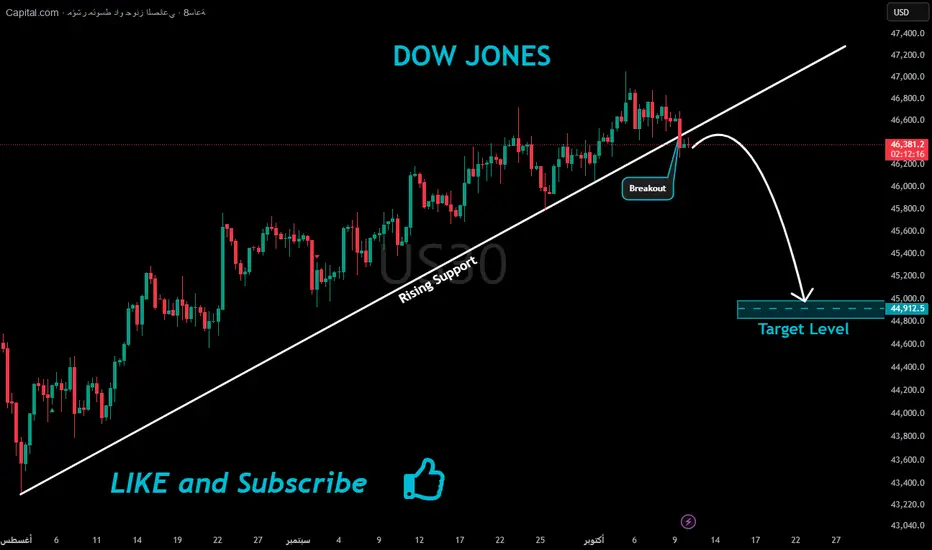 حقق مؤشر #US30 اختراقًا هبوطيًا لخط الدعم الصاعد،
