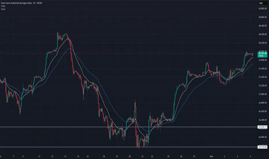 US30 pushed back into the 47,950โ48,000 resistance zone after a clean trend continuation, with price now stalling near the highs. Bulls remain firmly in control as EMAs continue to slope upward, but momentum is slowing as we approach a major supply area ๐๐.